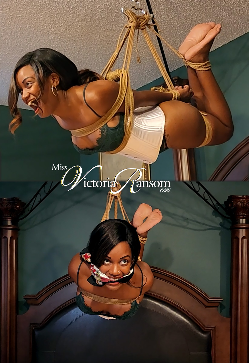 Guess what? It's my first suspension guys! I've asked my friends at XSiteAbility to assist me in flying high in rope. I'll tell you all about how it felt soon, after my silk scarf cleave gag is removed! But first let me just hang out in this barefoot hogtie, high above the four-poster bed, suspended from jute ropes tied around me, in a corset bondage caress that makes me feel like I'm floating!